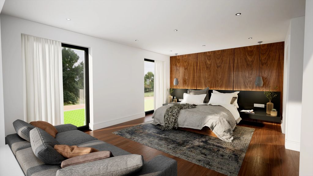 The bedrooms are crafted to evoke a sense of peace and serenity, featuring soothing tones, tactile textures, and thoughtfully designed lighting. Master suites are elevated with custom-built joinery, combining functionality with understated elegance.